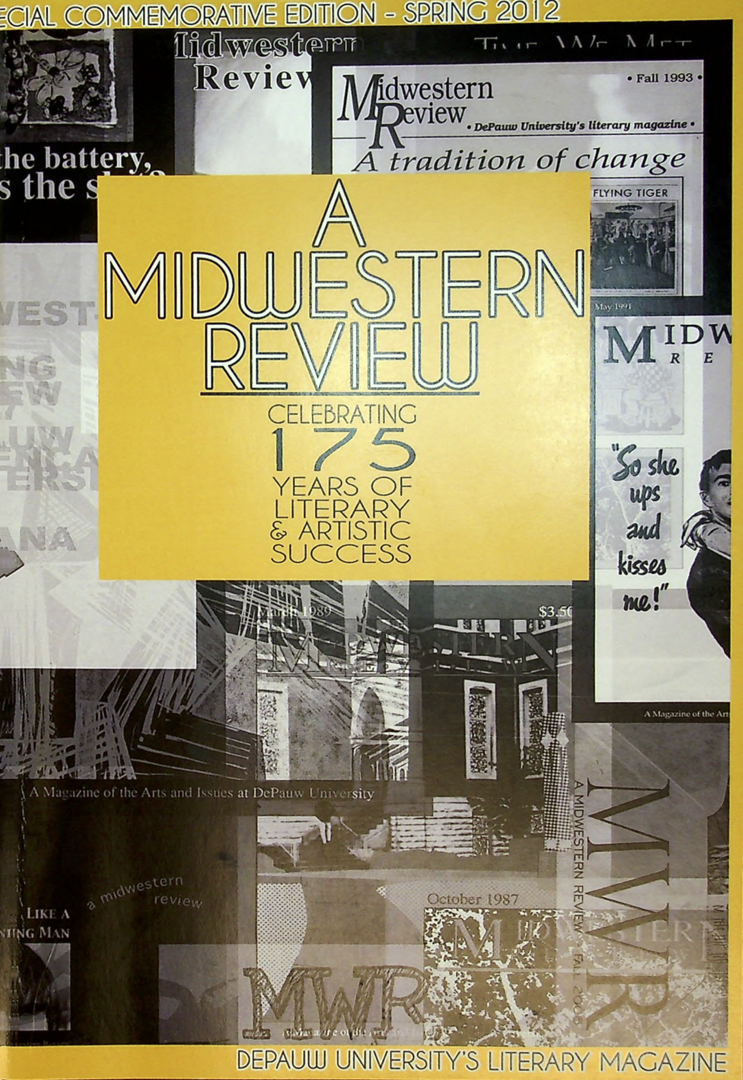 DePauw University turned 175 years old on January 10, 2012. That is quite an accomplishment. The literary magazine tradition at DePauw is scarcely less impressive, with the first publication of such a magazine coming only 10 years after the University’s charter was signed. In order to celebrate DePauw’s literary tradition, we have decided to do things a bit differently for this semester’s A Midwestern Review. As a way to thank our literary progenitors, we have republished undergraduate works from DePauw alumni who have flourished in literary careers. But we also aim to showcase the current pool of literary talent, as these writers too have made their mark on DePauw’s literary tradition. This publication is a confluence of past and present. We have woven works from such alumni as Max Ehrmann ’94 (that’s 1894), whose poem “Desiderata” sparked an authorship controversy; John Jakes ’53, whose early short story reprinted here presages the success of his bestselling Kent Family Chronicles; Barbara Kingsolver ’77, whose novels have been nominated for the PEN/Faulkner Award and Pulitzer Prize; and Micah Ling ’03, winner of the 2011 Eugene and Marilyn Glick Indiana Emerging Author Award. We hope that this interwoven timeline of alumni highlights the genealogy of the DePauw literary tradition.
